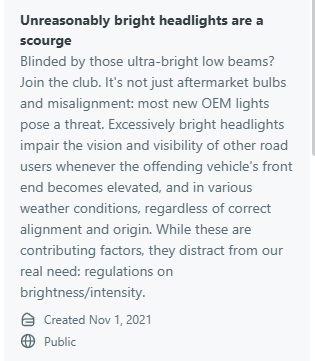 What we would like to see is AAA initiating a campaign with its 60,000,000 members to hound Congress, NHTSA, the FDA, and IIHS into doing something to regulate LED headlights.