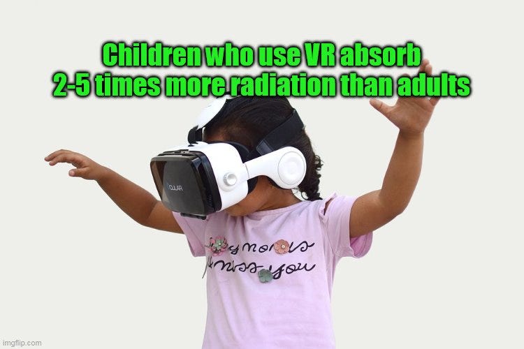 GreenMed: Immersed in Danger: The Shocking EMF Risks Lurking in Your VR Headset "The immersive worlds of virtual reality transport us to faraway lands and futuristic adventures - but could this captivating technology come at a hidden cost to our health? As VR's popularity skyrockets, so too do concerns about the invisible radiation these devices emit just inches from our eyes and brains.... A growing body of research suggests that the electromagnetic fields (EMFs) emitted by VR devices - the same non-ionizing radiation produced by cellphones and wireless tech - may pose significant health risks, especially for children. An independent analysis found the popular Oculus Quest VR headset emits radiation up to 5 times higher than the FCC's safety threshold of 1.6 watts per kilogram (W/kg)." https://greenmedinfo.com/content/immersed-danger-shocking-emf-risks-lurking-your-vr-headset